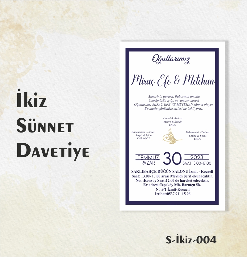 1000 ADET İKİZ SÜNNET DAVETİYE / S-İKİZ-003